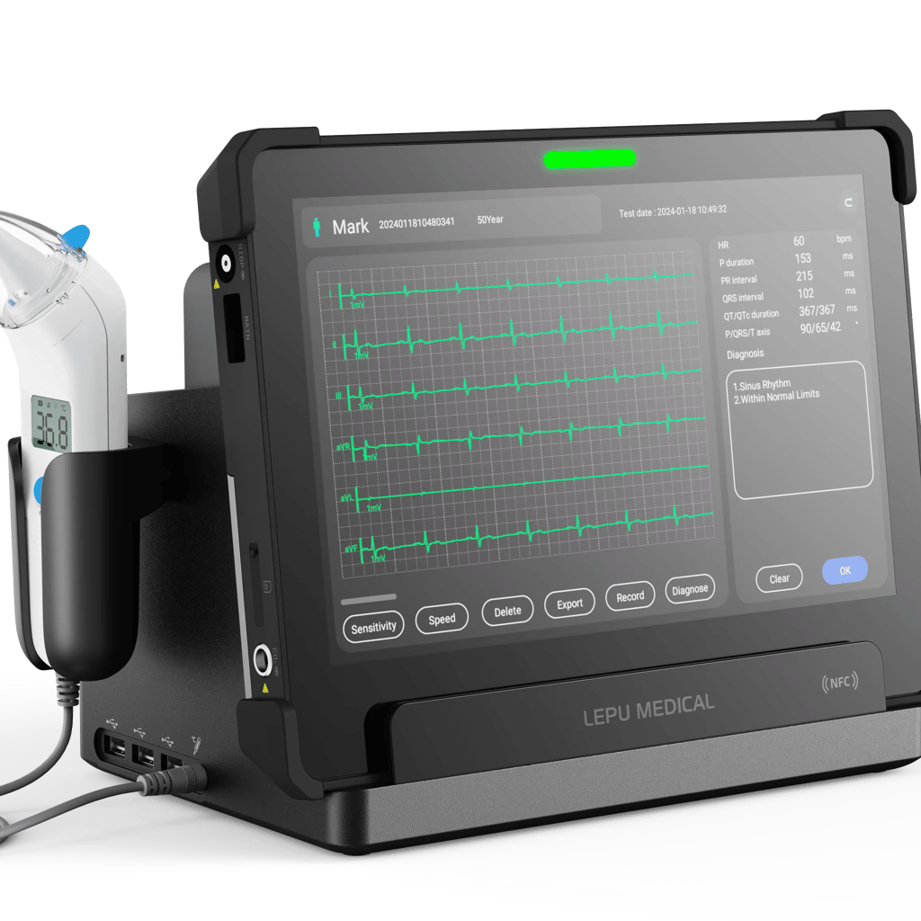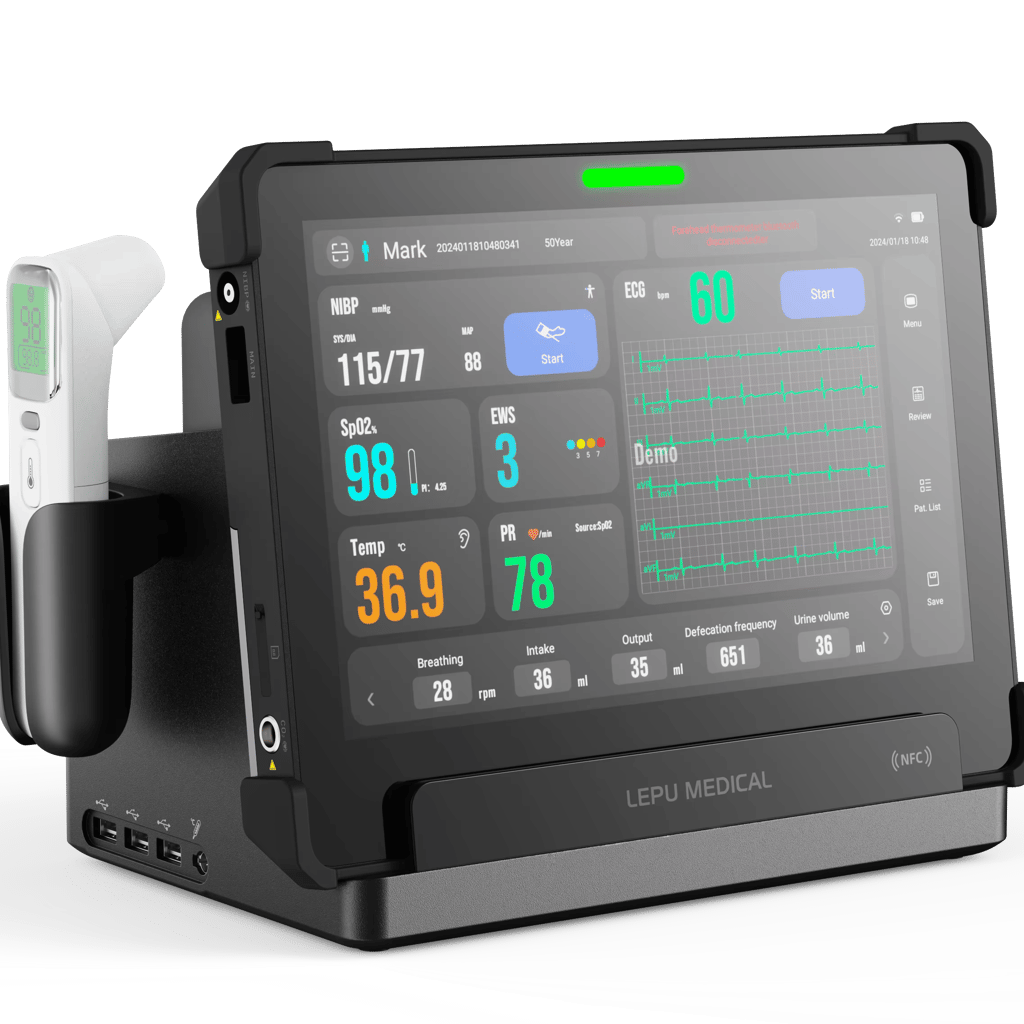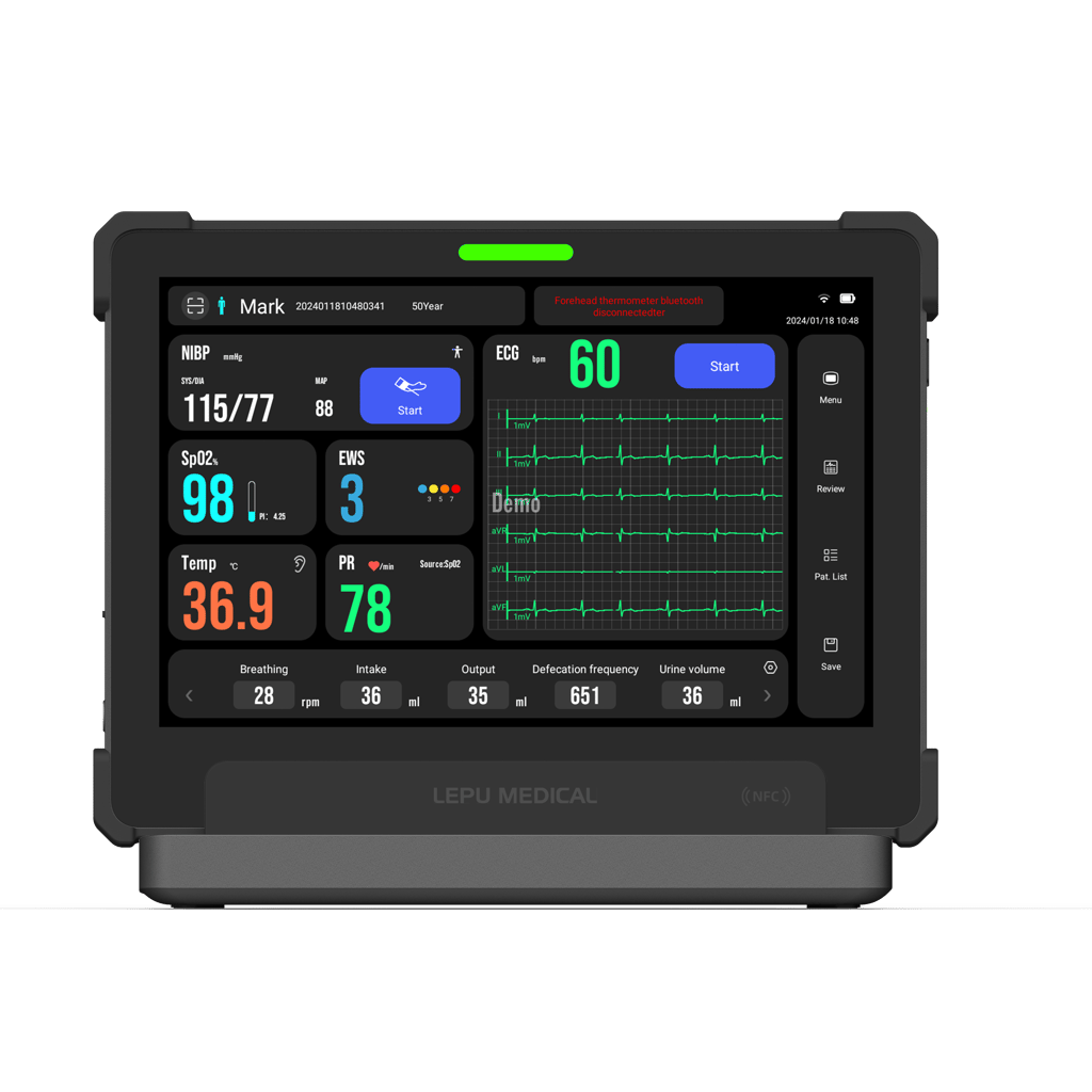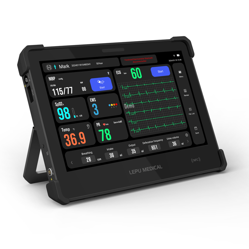 Stay connected and monitor your vital signs with ease using our AI remote monitoring device. With Bluetooth support, you can easily connect to a forehead or ear thermometer for accurate temperature readings. The ultra-light and tablet design makes it convenient to use, with a weight of only 1.35KG including the battery.
