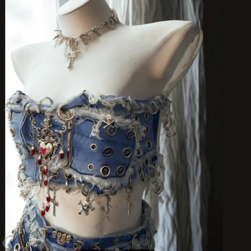 Distressed denim bandeau and skirt set